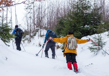 Guided snowshoe Rokua UNESCO trail with campfire: River floating (only if conditions allow), Folk Music Concert and workshop at Glass Room
